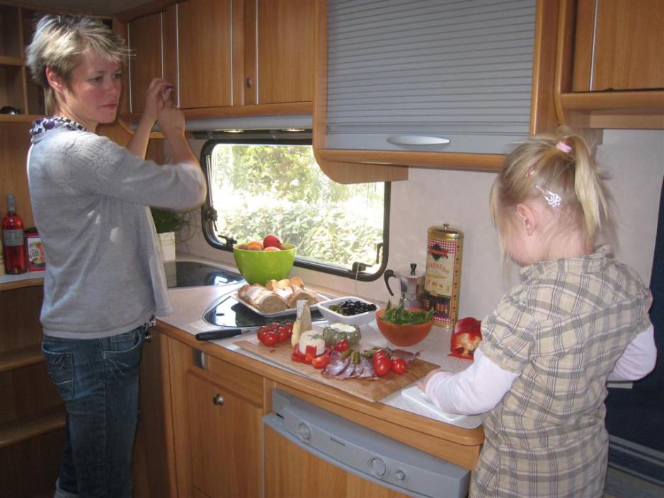 Kjøkkenet er virkelig et stort pluss i denne vognen, hvis man liker å lage mat og barna i tillegg gjerne vil hjelpe til. Til høyre for vasken er det stor benkeplate, der mindre barn kan stå og hjelpe til i sikkerhet – borte fra gasskomfyren. Bordet er høyt.Det er masser av praktiske skap og uttrekkskuffer. Kjøleskapet er, vognens størrelse tatt i betraktning, imidlertid for lite, med mindre man handler hver dag. Det er godt med gulvplass foran kjøkkenet, slik at man lett kommer forbi hverandre. Det gir en følelse av romslighet.