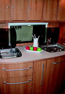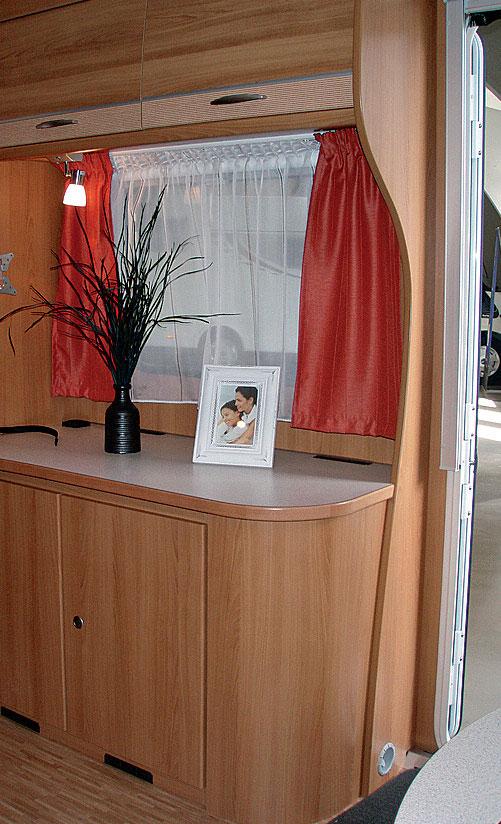 Midt i vognen finner vi badet, klesskap og kjøkkenet. Vi tar først for oss klesskapene. Det er ett stort uten hyller, men med opphengsstang i toppen. Typisk for å henge av seg jakker, skjorter og annet som bør henge på en kleshenger. Høyskap nummer to har flere hyller, så plass for klær er det nok av. Testvognen vår er beregnet for to personer, og da har vognen totalt sett mye plass til oppbevaring. Ved siden av disse to høyskapene er kjøleskap og frys montert.Det er et 175 liter stort skap fra Dometic, med separat fryseboks. Da har vi kommet frem til selve kjøkkenplassen, som er plassert ved siden av baderommet, og vis a vis kjøleskapet. Benkeplaten er stor og innbyr til matlaging. Den har en oppvaskkum og tre bluss. Under benkeplaten er det masse plass til matvarer, redskap og bestikk. Et stort skap med to hylleplater, et uttrekksskap med tre tråhyller, en stor bestikkskuff og et mindre skap med en hylleplate.Over benken er det fem overskap i stilig design. Fem spotter gir godt arbeidslys på benkeplaten. Skal du ha middagsgjester så kan du invitere disse med god samvittighet. Kjøkken og sitteplass gjør sitt for at stemningen rundt bordet skal bli god.
