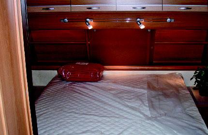 Soverommet er plassert foran i vognen, og inneholder i vår modell en dobbeltseng med gangplass på hver side. Det gir gode tilgangsmuligheter uansett hvilken side av sengen du ligger på. Det er montert en egen takluke på soverommet, og med en skyvedør stenger du av mot resten av vognen.Oppbevaringsmulighetene er mange på soverommet. Under sengen er et stort rom, og tilgangen er enkel ved å løfte opp sengebunnen. Denne står oppe av seg selv. Over sengen er det fire overskap, samt at det er skap og hyller på veggene i rommet. To spotter sørger for godt leselys.