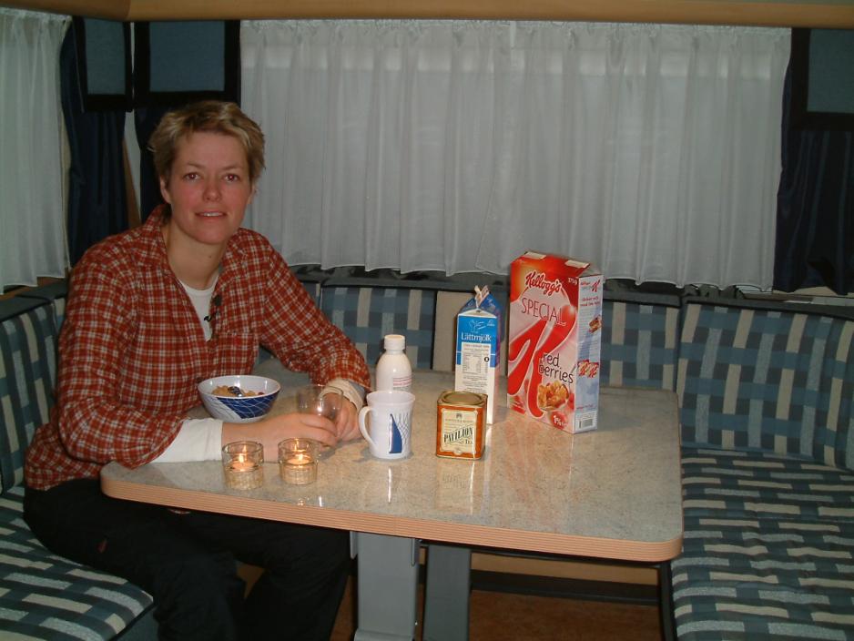 Truma varmluftsovn er vår eneste varmekilde og det fungerer helt utmerket. Utover det har vi lagt på gulvtepper. Vi bruker litt mer gass enn ellers, men varmen fordeles bra, og det er bare kaldt de få stedene, der hvor gulvteppet ikke dekker. Om natten er det ned mot minus 10 grader. Om dagen, når vi ikke er i vognen, trekker vi ned gardinene, for vinduene er de største kuldebroene. Gardinene isolerer godt og det gjør at vi sparer litt på gassforbruket. Forteltet er også med på å minske kuldas eventuelle inntrenging i campingvognen. Hver morgen lufter vi godt ut, før vi forlater vognen.