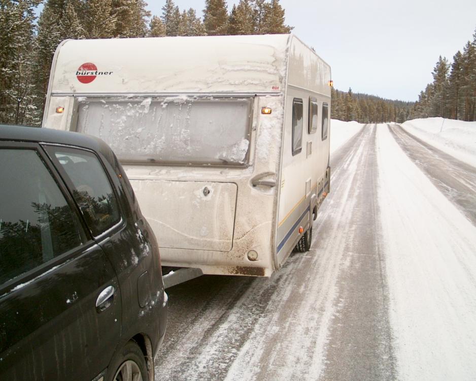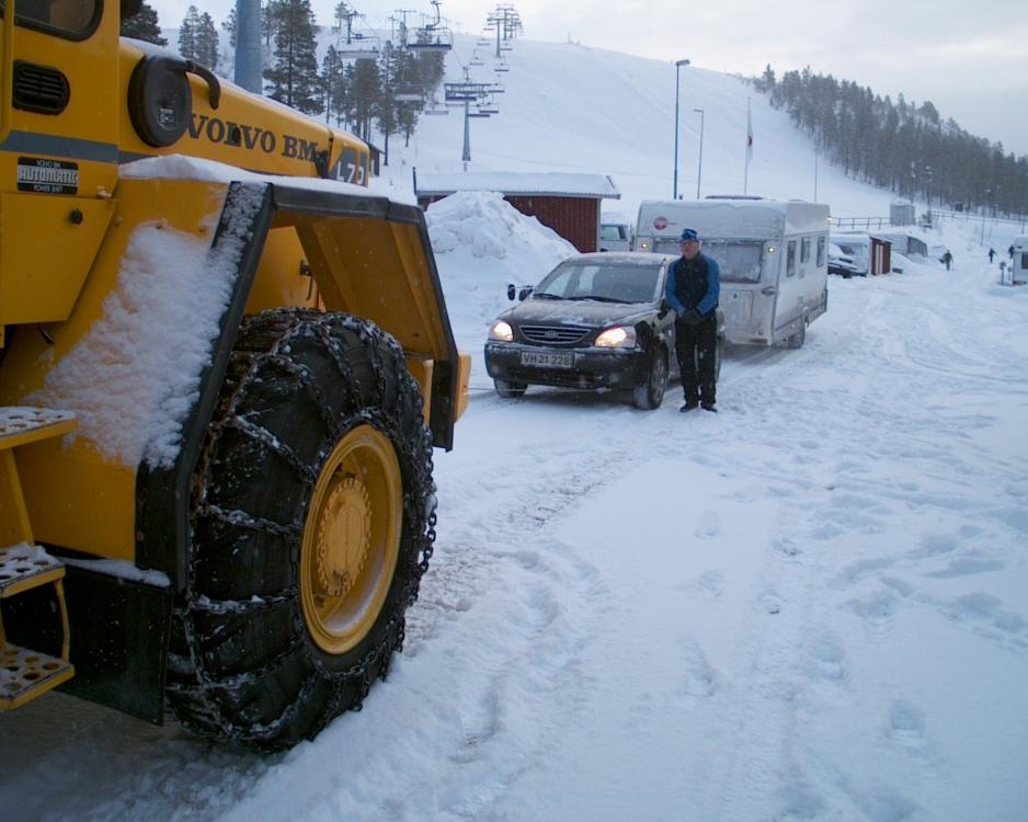 Det er blitt tid for å ta avskjed med Idre Fjäll, men samme morgen som vi skal reise, er det kommet 10 centimeter nysnø. Det skråner en liten aning på campingplassen og det er nok til, at vi ikke kan komme opp. Det er mye brattere på veien ned fra Idre Fjäll sentrum og opp til selve plassen, men der tok vi god fart og kom opp uten problemer. Når du selv ankommer til plassen og er i tvil om du kan komme opp, så plasser campingvognen på den store parkeringsplassen. Hent plassjefen, som så henter campingvognen med weaselen.