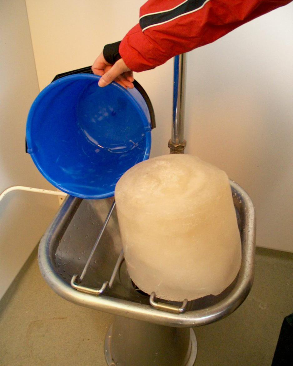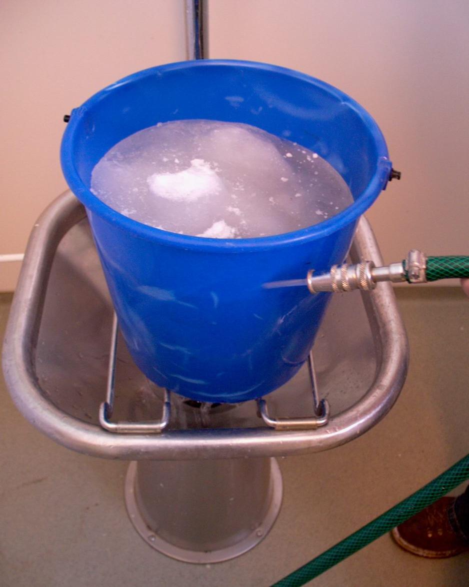 Hvis isklumpen ikke vil skli ut av spannet, så hell litt vann på yttersiden i stedet for å sparke på den.Frossen plast sprekker lett.