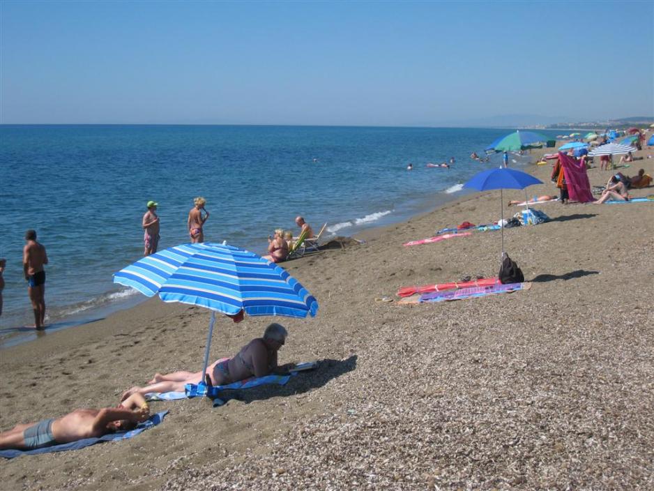 Ca. en kilometer fra selve plassen ligger Middelhavet og sandstranden, så mulighetene til å få badet og solt seg er på topp, men det er det også behov for, da temperaturen allerede i juni krabber opp på 35 grader. Vær oppmerksom på den kraftige solen. Strendene er helt klart velegnet til å døse og slappe av på. Blir man forstyrret er det i hovedsak av et par strandselgere, som selger tepper, vann, is og sandwicher.
