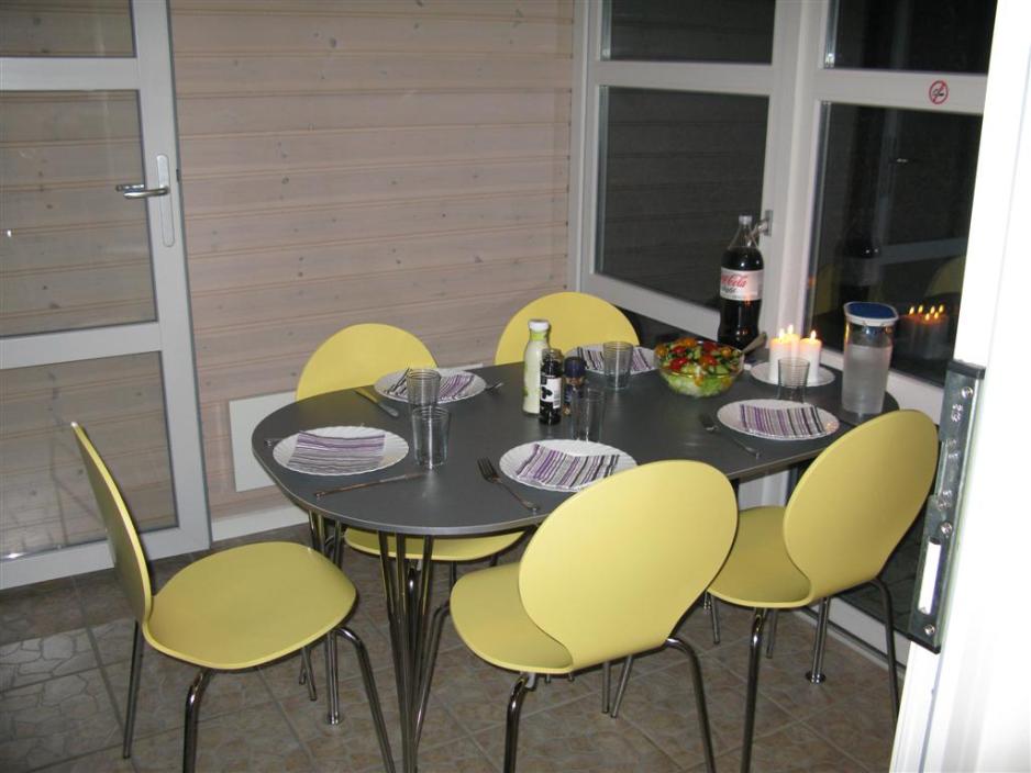 Campinghyttene på Kattegat Strand Camping er riktig smakfullt innredet. Fargen fra huset går igjen i innredningen og gardinene, så man føler gjenkjennelighet, så snart man går inn i huset. Når man kommer inn i huset, kommer man rett inn i spisestuen. Inngangspartiet og vinduspartiet på den motsatte siden er bygget av glass som kan åpnes helt om sommeren, slik at man får en slags overbygget terrasse. Gulvet er belagt med fliser så det er veldig rengjøringsvennlig. Spisestuen er innredet med et hvitt elipseformet bord med 6 stoler og på veggene på begge sider er det små knagger med plass til yttertøy. Det høres kanskje ikke så smart ut at det er plass for yttertøyet i spisestuen, men da skal man tenke på, at hytter på danske campingplasser bare får lov å være på 25 m2, så det er viktig å utnytte plassen så optimalt som mulig og dette synes jeg er kjennetegnet for campinghyttene på Kattegat Strand Camping.
