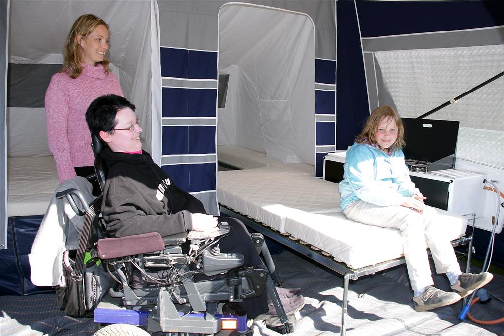 Eva Gerden har i flere år spekulert over, hvordan hun noensinne skulle bli i stand til å innvie datteren sin i sine egne gode campingopplevelser fra barndommen. Nå er den 37-årige bevegelseshemmede kvinnens drøm gått i oppfyllelse med en spesialinnredet danskprodusert Camp-let.Eva Gerden bor i Skåne. Hun lider av en medfødt muskelsykdom, og hun er i dag lenket til en rullestol. Seks hjemmehjelpere sørger på skift for, at den 37-år gamle kvinnen kan få utført alle de praktiske gjøremål. Det er derfor ikke bare datteren Kim på ni år, men også en hjemmehjelper, som skal være med, når Eva skal ut å nyte naturen og friluftslivet.- En alminnelig campingvogn er utelukket, fordi det er alt for liten plass til å komme rundt med en elektrisk rullestol. Da går det bedre med en bobil, men det ville medføre, at samtlige seks hjemmehjelpere måtte ha førerkort for tyngre kjøretøy. Det var egentlig ingen løsning, før jeg på nettet leste om en dansk familie, som hadde kjørt til Nordkapp med en Camp-let, og hvor enkelt det var å ha med en datter i rullestol i teltvognen, forteller Eva Gerden.Hun dro derfor på campingutstilling i Bella Center i København, etter at hun hadde forsikret seg om, at Camp-let var representert. Hun falt med det samme for teltvognen produsert på Sønderjylland, der hun i likhet med andre rullestolbrukere også enkelt kan betjene kjøkkenet.- Der var imidlertid et problem. Eva legges til sengs ved hjelp av en lift, og den kunne ikke løfte henne inn i en av sovekabinene. Vi kunne imidlertid se, at liften kunne brukes i en gjestekabin, og jeg var sikker på, at vi saktens kunne endre litt på telt og stenger og skape den nødvendige plassen til liften, forteller markedssjef Hans Jørgen Nissen.Hjemme på fabrikken var de to direktørene, Henrik og Arne Nissen, straks med på ideen, og før noen hadde sett seg om, hadde de tenkt ut en enda smartere løsning. Den ene sovekabinen i Eva Gerdens vogn er nå utstyrt med en ”uttrekkshylle med en spesialprodusert madrass. Ved hjelp av liften løftes hun over på ”hyllen” og skyves inn i sengen.Eva har vært på besøk på fabrikken i Gram for å se oppfinnelsen, og hun var begeistret. Det var imidlertid ytterligere et par modifikasjoner som måtte løses, før hun et par uker senere var kjøreklar.- Jeg var med mine foreldre på camping, når jeg var barn, og jeg har gledet meg til, at Kim skal ha de samme glade opplevelsene. Jeg er Jehovas Vitne, og Camp-let’n ble innviet under et stort stevne i Gøteborg.- Vi skal imidlertid også på campingferie i sommer. Vi kjører en tur ned gjennom Tyskland og seiler over til England. Her skal vi både til London og tilbringe campingferien nede i Syd-England. Og jeg kan love deg, at både Kim og jeg gleder oss veldig til å komme av sted, forteller Eva Gerden.