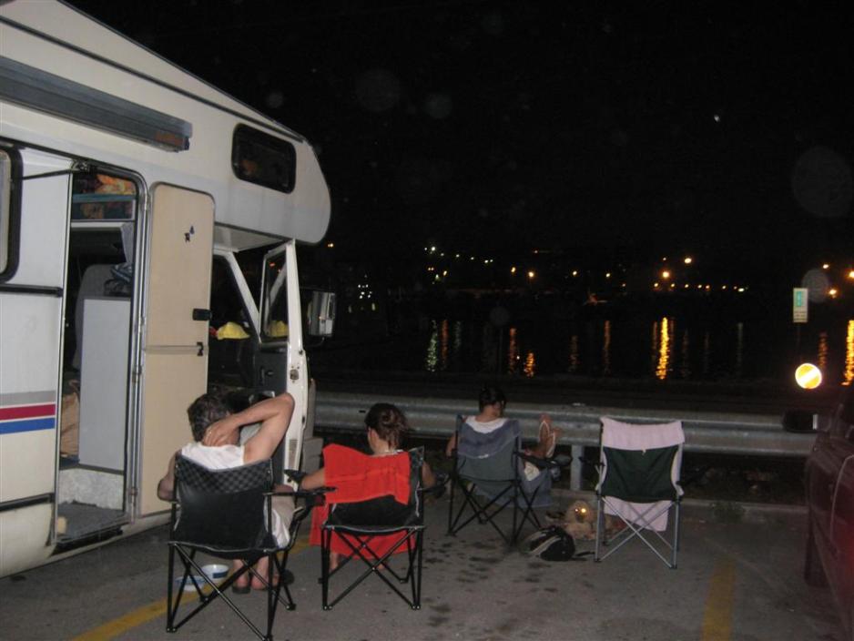 Der blir raskt en god stemning på campingdekket. Folk setter ut et par stoler på den begrensede plassen og man åpner vinduer på vidt gap, med hensyntagen til hverandre. Våre to 16-år gamle jenter sjekker straks ut poolen og vi går på dekk og titter oss litt rundt. Vår gamle bobil ”Berta” står ved siden av ”Dino” med tyske beboere, som skal ta turen helt til Afrika og være borte et år og slik kommer vi i snakk med forskjellige andre campere. Vi er mange som står sammen og ser kveldsolen synke ned i horisonten i et brus av skum fra kjølvannet etter båten.Jentene tar på seg pene klær og går opp for å se litt på kveldslivet, men kommer imidlertid raskt tilbake. Vi nyter alle å sove i den friske havluften, som strømmer inn gjennom vinduene.Allerede kl. 05.30 er det liv på dekket, da vi legger til kai i Igoumenitsa på det greske fastlandet. Lastebiler rygger fra borde og fra campingdekket rygger de bort til en rampe, som lifter dem ned i ”førsteetasje”. Etter et snaut døgn legger vi til i Patras og vi kjører ut i det greske eventyret.