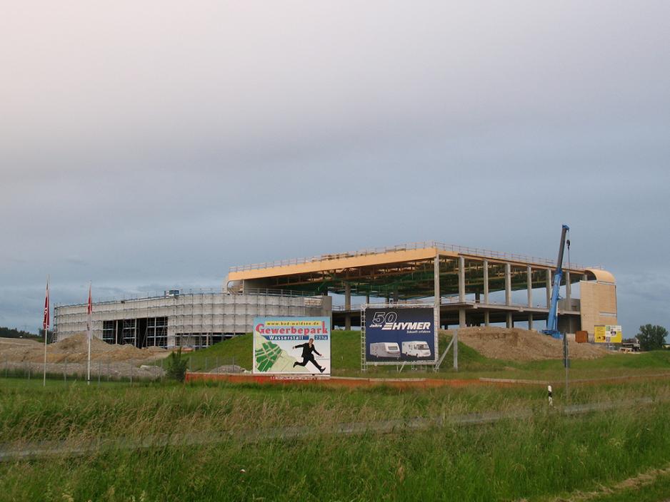Allerede før den offisielle innvielsen framstår det framtidige Hymer museumsbygget i Bad Waldsee allerede med en oppsiktsvekkende arkitektonisk profil, med utgangspunkt i et stilisert campingvognvindu.