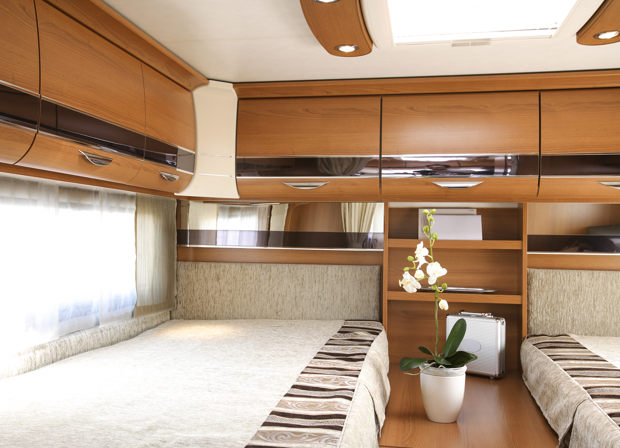 Her er det enkle senger bakerst, med et romslig lasterom under, dit det er tilgang utenfra. Det er trinn ned til toalettet, som ligger foran soveavdelingen. Kjøkkenet er plassert ovenfor døren, og forrest er det en romslig rundsittegruppe.