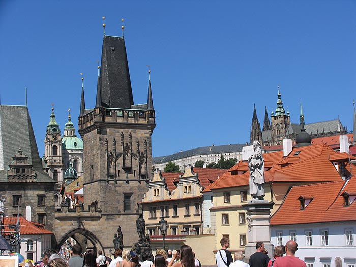 Byens hjerte slår på Karlsbroen. Herfra går alle ruter både til bydelene vest og øst for elven. De helt fanatiske tilhengerne av byen mener, at Karlsbroen er best når dagslyset bryter igjennom.Karlsbroen er den mest kjente broen over Moldau i Prahas sentrum. Den nåværende broen sto ferdig på begynnelsen av det 15. århundre og var til midten av det 19. århundre den klart viktigste forbindelsen mellom Prahas borg på vestsiden av elven og Staré Město (Den Gamle By) på østsiden. Broen het opprinnelig Steinbroen eller Prahabroen, men den fikk offisielt sitt nåværende navn, oppkalt etter grunnleggeren, Karl 4. i 1870.Broen er 516 meter lang og nesten 10 meter bred. Den har 16 hvelvinger og beskyttes av tre tårn, herav to på vestsiden og et på østsiden. Broens rekkverk på begge sider er prydet av en samling på 30 statuer og skulpturer.