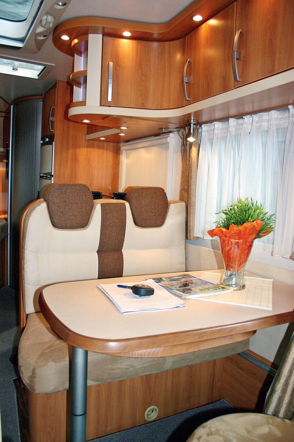 Sittegruppen består av baksete, to forstoler og sidesitter for to (96 cm bred). Bordet er veggfast og måler 98 x 58 cm og kan forlenges med en 45 cm klaff. Det betyr sitteplass for seks og spiseplass for fem. I baksete er vanntanken plassert og i sidesitteren tar gasskassen mye av plassen. Den resterende plassen kan benyttes til bagasje, men her ligger en åpen varmluftslange på gulvet som ikke tåler mye vekt før den blir flat.Det finnes fire trepunkts sikkerhetsbelter, og omgjort til seng måler denne 200 x 96/105 cm. Som hos de fleste konkurrentene er ryggstøet i baksetet for rett og et lengre opphold under kjøring vil kreve medbrakte sofaputer. En sittegruppe på det jevne.