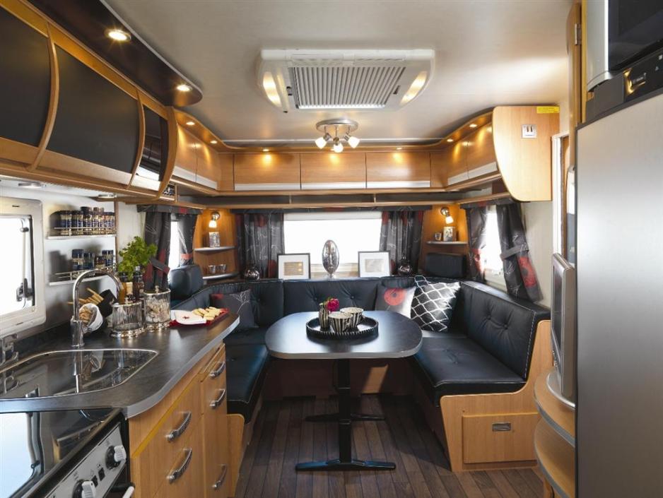 Black Line tilbyr en innredning ut over det vanlige. I vognen er det blant annet et spisebord i sort laminat. Sort skinn er benyttet som trekk i sofagruppen, som til overmål er utstyrt med et par nakkeputer. Lukene i overskapene og vitrineskapet er i mørkt tonet glass, og sofagruppens stilrene trekk hever interiøret opp i en høyere dimensjon. Kjøkkenet framstår også elegant med sort laminat på benkeplaten og krydderhyllen.Fronten på kjøleskapet er i børstet aluminium. Soveavdelingen har en deilig dobbeltseng med fjærmadrass og stillbar hodeende, og ved siden av soveværelset er det et flott innredet badeværelse med behagelig belysning. Utvendig har man valgt å beholde den klassiske Cabby looken.