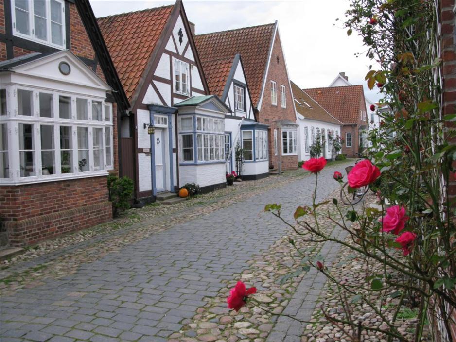Ikke et ord til om kniplinger, men ta veien forbi Møgeltønder. Byens hovedgate – Slotsgate – er og blir en perle, som godt kan konkurrere om tittelen ”Danmarks vakreste landsbygate”.Slotsgaten, med de forskjellige sirlig lagte brosteinene så vel på fortauet som i kjørebanen, er flankert av en allé av lindetrær. De vakre gamle husene – hvorav mange er fredet – står tett langs hele alléen. Som leder fram til Schackenborg.