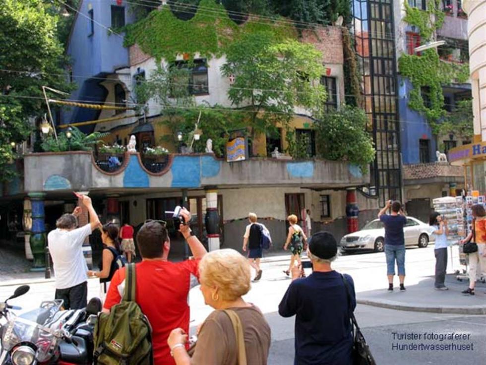 Det er et egennavn, selv om det også kan bety ”hundre vann”, noe som man nok kunne lures til å tro i varmen på sykkelstien. Det er ganske enkelt navnet på en moderne arkitekt, som er blitt veldig berømt. Spesielt her i Wien. Byen har jo på forhånd en overflod av bygningsmessige severdigheter, så hvorfor egentlig beskjeftige seg med moderne byggevirksomhet? Han var egentlig maler og gikk veldig inn for økologi. Det var vel å merke på et tidspunkt, da det ikke var så veldig mange andre, som gjorde det. På et tidspunkt inngikk han et samarbeid med en arkitekt, Professor Krawina fra Berlin. Sammen hadde de en ide om å lage hus, der menneskene ville føle seg bedre til pass og i en nærmere tilknytning til naturen og dens former. I 1983-86 virkeliggjorde de sine ideer i et bygningskompleks, som i dag er et av de mest besøkte hus i Østerrike. Nå kan man ikke besøke huset innvendig, fordi det er private leiligheter. Det er imidlertid likevel verdt et besøk og veldig beundringsverdig.Langs med sykkelstien møter vi allerede en av de bygningene, som er ført opp i hans stil – og det er et el- eller kraftverk.