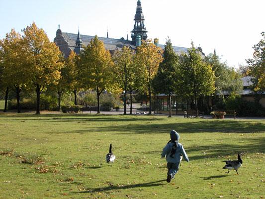 Ved Djurgården er det gode muligheter for å parkere. Under normale omstendigheter ville vi nok ha tatt offentlig transportmiddel inn til byen, men i og med at Mie er så liten, er det fint å ha bobilen og alle tingene for hånden. Når Mathias skal sove middag, kan vi også bare strekke oss ut i bilen. På den måten har vi hele dagen inne i byen. I parken foran Junibacken og Nordisk Museum, får Mathias lov til å løpe, mens vi går en tur. Det er kjølig, men høstværet er klart.