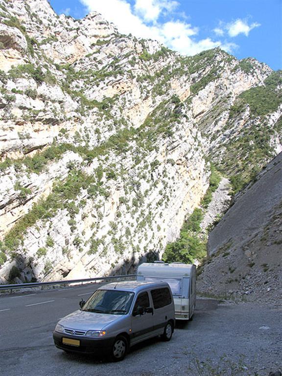 For nervøse sjeler skal det sies, at det er godt veibelegg overalt og det er godt autovern mot elvesiden. Over fjellet skal man først etter landsbyen La Tuiliére. Her forlater man nemlig elven og det går oppover. Åtte serpentiner leder deg oppover og deretter følger enda en strekning med svak stigning, inntil du når passet Col de Léques i en høyde av 1220 m. Det er en praktfull utsikt her oppe fra, klimaet er jo ganske stabilt på disse kanter og om sommeren ses sjelden skyer. Dessverre er det dårlig plass til å stoppe. Etter passet kommer det flere serpentiner, men her går det nedover så nå gjelder det å kjøre på lavt gir og bremse så lite som overhodet mulig. Du havner faktisk midt på torget i Castellane og her må du absolutt campe før du fortsetter reisen mot syd. De fleste campingplasser ligger langs vei D 952, som starter ved torget. Sving til høyre. Vei D 952 er også utgangspunkt for turen til Verdonkløften.