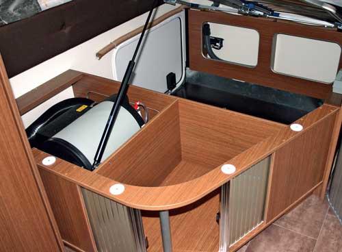 Med denne løsningen får du ikke garasje, men plassen under sengen bak er godt utnyttet og det utvendige bagasjerommet måler 120 x 112 x h 65 cm med ekstra centimeter både her og der. I tillegg er det et rom ved siden av kombivarmeren med tilgang innenfra. Klesskapet måler 54 x 40 x h 118 cm og har en stor hylle over. Det er bra med overskap og som tidligere nevnt er det en hylleseksjon ved siden av kjøleskapet i full høyde som gjør susen om ikke plassen i kjøkkenbenken strekker til.