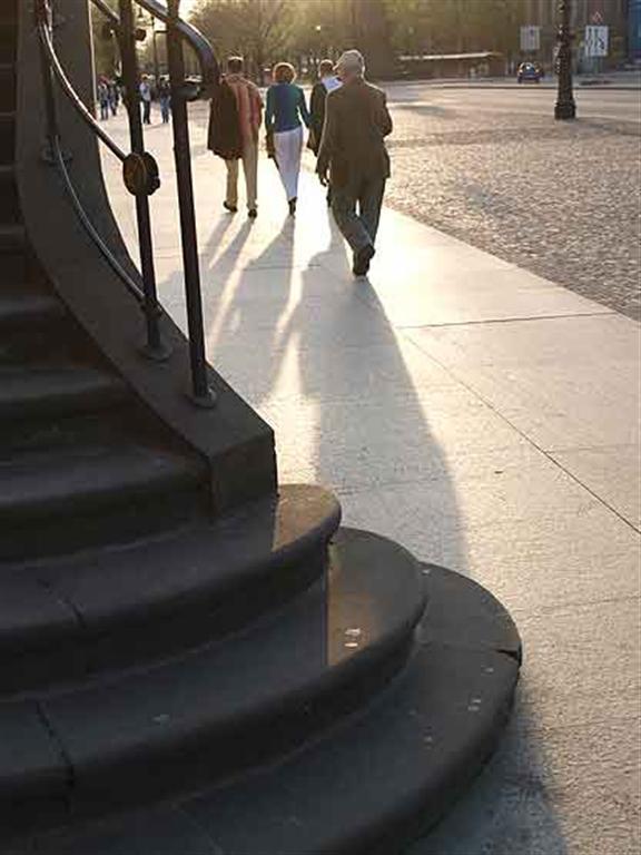 Det første stykke vei på vår reise fra vest mot øst heter Heerstrasse. Det navnet kjenner mange av oss, som reiste til Berlin før muren falt. Det var den eneste veien man kunne komme inn fra Danmark via. Fra Theodor-Heuss-Platz skifter aksen navn til Kaiserdamm (i bydelen Charlottenburg), deretter Bismarckstrasse og endelig Strasse des 17. Juni, et navn den fikk etter den mislykkede oppstanden mot den sovjetiske okkupasjonsmakten i 1953. Denne flotte og veldig brede bulevarden går forbi Tiergarten til den store plassen Grosser Stern med seierssøylen på toppen. Bare på strekningen gjennom Tiergarten er bulevarden 2,5 km lang og slutter ved Brandenburger Tor. Så starter den neste store bulevarden: Unter den Linden med en lang rekke bemerkelsesverdige bygninger, som jeg vil komme tilbake til.