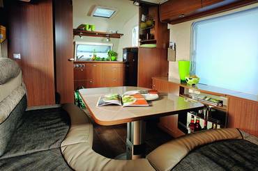 Salongen er plassert helt bakerst og er etter min mening vognas perle. Det kombinerte sove- og stuerommet opptar neste halvparten av vognas boareal. Sittegruppa er L-formet og med god plass til fire voksne som sitter svært godt. Høyt ryggstøtte og god polstring gir svært god sittekomfort. Bordet er montert på ei bevegelig skinne. Dette lette fremkommeligheten, samtidig som det gir god tilgang til skaprekka på motsatt langvegg. Hele sju spotter i taket og fire under overskapene gir svært god belysning. Her kan det bindes fluer i de sene nattetimer. På grunn av senkesenga er det begrenset med overskap i sittegruppa. Kun to finnes. Konklusjonen blir ei svært trivelig og stor sittegruppe.