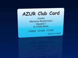 AZUR Club Card koster ved første bestilling 25 Euro for 2 hele sommersesonger. Ved bestilling innen 30. september gjelder kortet til utløpet av det neste året. Ved bestilling etter 30. september gjelder det til utløp av det andre påfølgende året. Slik er utløpsdatoen alltid 31. desember. Ved fornyelse av kortet betales 12.50 Euro pr. år, forutsatt at bestilling og betaling gjøres innen kortets utløpsdato.AZUR Club Card gjelder for hele familien og medfølgende familiemedlemmer.Kortet kan bestilles her: https://sslsites.de/www.azur-camping.de/html/azur_club_card_cc.php