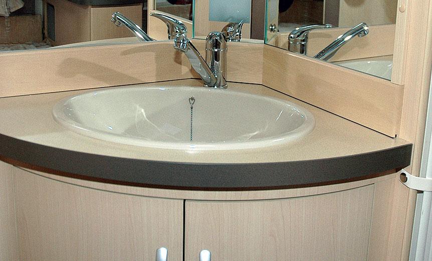 Det sanitære er todelt og er plassert ved siden av sovedelen helt fremst i vogna. Dusj og Thetford kassettoalett med elektrisk spyling innenfor døren, mens håndvask og skapplass er plassert utenfor. Dette gir selvsagt den positive effekten at når de mest intime gjøremål foregår bak en lukket dør, kan en annen person likevel foreta barbering, tannpuss eller sminking. Vasken er plassert i et hjørne med speil på begge veggene. Det som trekker litt ned er selve servanten. Denne er laget i plast og virker litt billig. Vanntanken er fast og rommer 50 liter. Spillvannet går i en 22 liters trillbar spillvannstank.