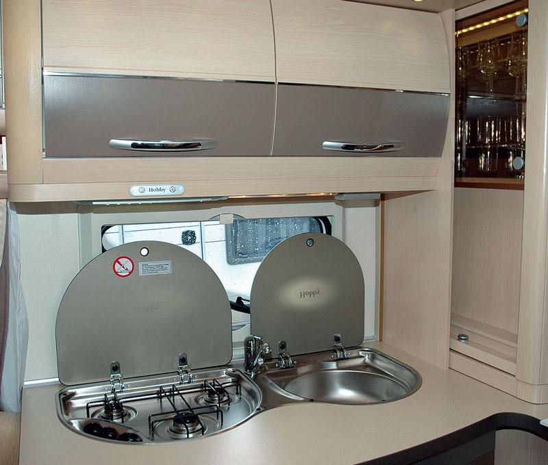 I kjøkkenet er det en konvensjonell gassovn med tre kokeplater. Stekeovn med elektrisk tenning og grill kan monteres som ekstrautstyr. Standard er et Dometic kjøleskap på 112 liter med fryseboks, som kan drives av 220 volt, 12 volt og av gass. Vaskekummen er solid og laget i edelstål. Skapplassen nede består av en bestikkskuff med kulelageruttrekk og et uttrekkbart skap beregnet for tørrproviant. Dette skapet er seksjonert. Til høyre oppvaskkummen er det et dreibart barskap med plass til glass, flasker og en flatskjerm. Dette skapet kan dreies 180 grader. Avlastningsplass er det svært lite av. Bordet ved sittegruppen er ikke langt unna og er et alternativ. Mellom overskapet og ovn/vask er det et vindu som gir godt lys på dagtid. I tillegg er det godt med belysning under overskapet. Søppelbøtta er plassert i inngangsdøren, som er to skritt bak kokken.