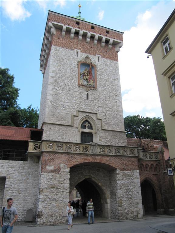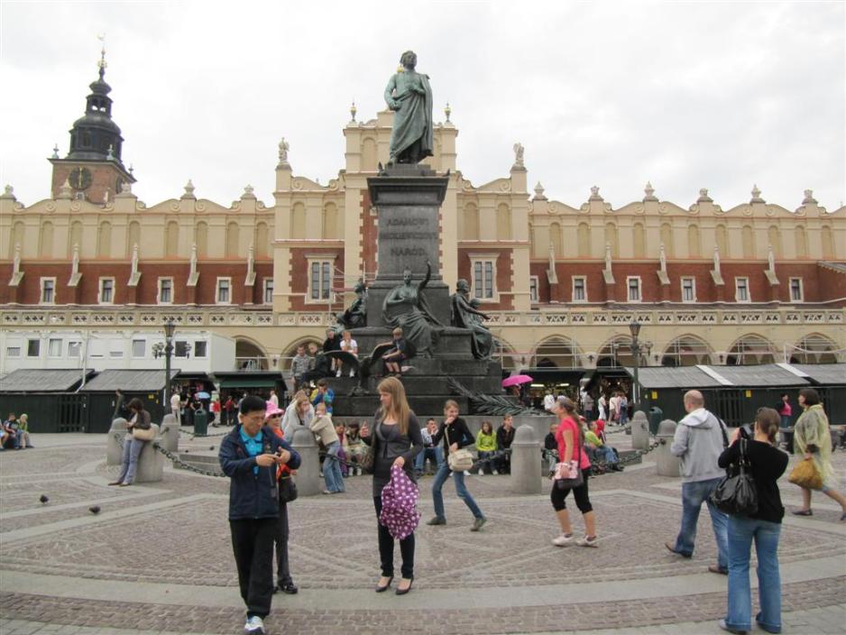 Det flotte rådhuset (mot vest) troner flott over markedsplassen. Det er bare selve tårnene som er igjen av det opprinnelige rådhuset fra 1383. Krakow unngikk de store ødeleggelsene under 2. verdenskrig og det for markedsplassen også utrolig flott med mange gamle bygninger. Rett ved siden av rådhuset står den lille sjarmerende St. Aldaberts Kirke, som daterer seg helt tilbake til år 1.000.