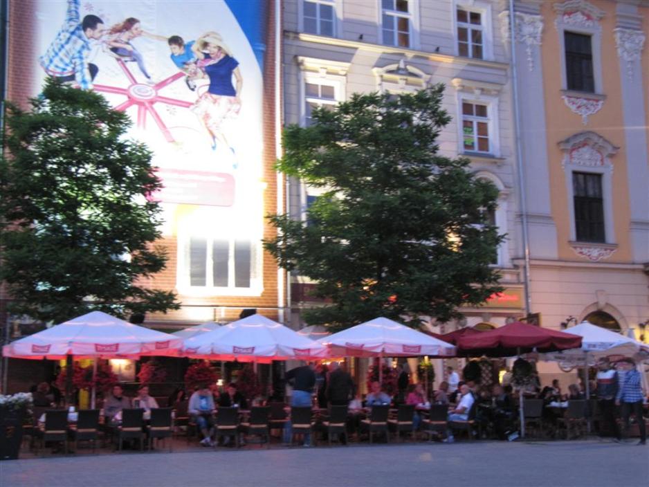 Når mørket faller på endres hele atmosfæren på markedsplassen. Alle er ute. Alle er glade. Samtlige kafeer og fortausrestauranter fylles opp av glade og opplevelseslystne turister og fastboende. Det hele blandes med nonner og munker, som stille tasser over markedsplassen, mens hestene pruster og venter på sin neste tur.Det er spisesteder i alle prisklasser og med forskjellige temaer. Prøv evt. polske spesialiteter – det minner om gammeldags husmannskost, så man blir helt sikker mett. Prisnivået er omtrent som hjemme.