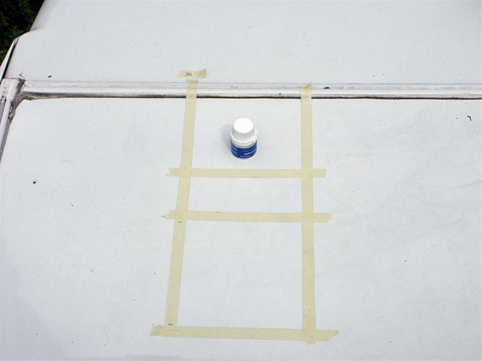Tid for å klatre opp på taket og måle ut hvor solcellepanelet skal ligge. Marker med maskeringsteip hvor hjørnene havner. Vask med spesialrengjøringsmiddelet de delene av taket der plasthjørnene skal limes fast.
