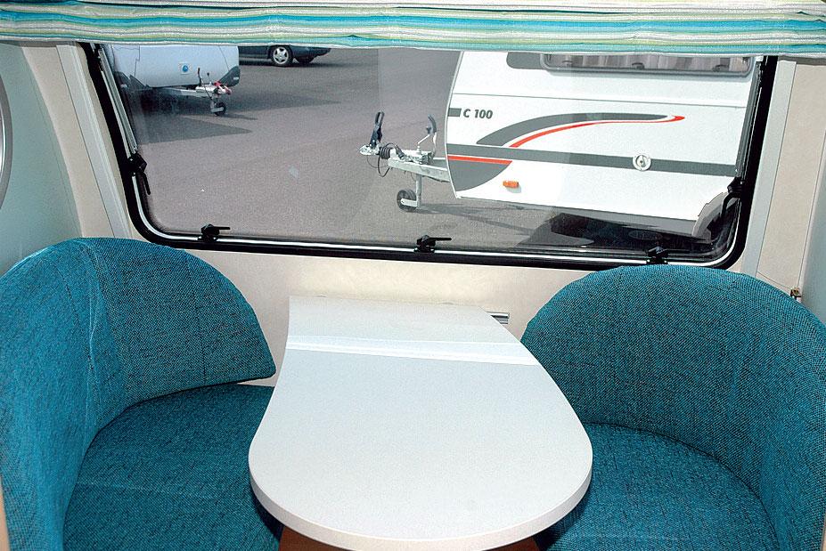 Sittegruppen er plassert helt fremst i vogna. Denne utgjøres av en enseter i det ene hjørnet og en lite toseter i den andre, Her er det plass til to voksen og et barn. Sittekomforten er grei nok, men heller ikke mer. Over hver av sitteplassene er det plassert to vinduer av koøye-typen. Et av disse utgjør, sammen med to åpne hyller over vinduene og ei smal og åpen hylle over vinduet på endeveggen, skapplassen i sittegruppa. Under toseteren er den fastmonterte vanntanken plassert.Denne opptar mesteplassen av lagerplassen der. Det er noe lagerplass under enseteren. Bordet kan slås ned og gjøres om til ei seng