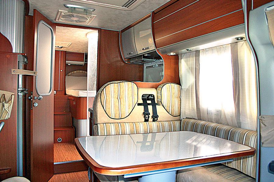 Sittegruppen er slik vi finner den i majoriteten av bobilene i denne klassen: L-sofa, sidesitter og vendbare forstoler. Men det er ingenting i veien med det, her sitter fem mennesker bra. L-sofaen kan selvfølgelig åpnes slik at to personer sitter med belter i kjøreretningen. Ryggen i baksetet er foret ut for korsryggstøtte, men ikke tilstrekkelig, så ta gjerne med sofaputer hjemmefra om personer sitter her under kjøring. Bordet måler 100 x 69cm og det kan skyves i begge retninger pluss senkes til sengehøyde. Ved hjelp av tilleggsputer, kan det res opp en seng med målene 205 x 117/135cm, altså en dobbeltseng. I sidesitteren er gasskassen plassert men det er fortsatt noe plass for oppbevaring. I baksetet står vanntanken og trykkvannpumpen.