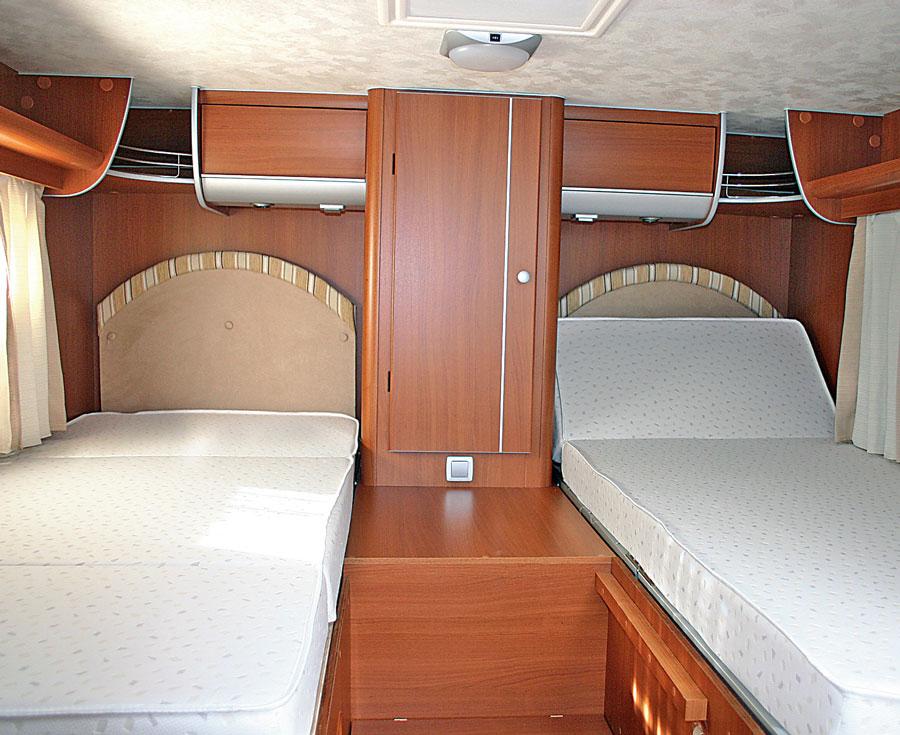 Begge de to enkeltsengene måler 192 x 80cm. Det er 10cm tykke madrasser på fjærende trespiler. Madrassene ligger 95cm over gulvet og to trinn fører opp til den midtre delen av sengene. Om ønskelig kan også et brett og en madrass fylle det meste av mellomrommet mellom sengene. Enkeltsenger med god tilgjenglighet og behagelige madrasser, vi tror de fleste vil trives her. Klesskapet er plassert mellom sengene, for øvrig er det kun to overskap resten hyller. Dette oppveies av et romslig skap under fotenden av den ene sengen og et rom over varmeren, under fotenden på den andre sengen. Av belysning er det taklampe og to leselamper. I varme strøk er to luftevinduer og takluke en nødvendighet. Men vi hadde gjerne sett at takluken med vifte hadde vært plassert her istedenfor over kjøkkenbenken. Her er det avtrekksvifte, og en vanlig takluke hadde vært tilstrekkelig. På soveværelse er det fint å kunne la viften i takluken suge luften ut, da ville en gløtt på vinduene ved hver seng gi en sval bris inn. Bra soveværelse.