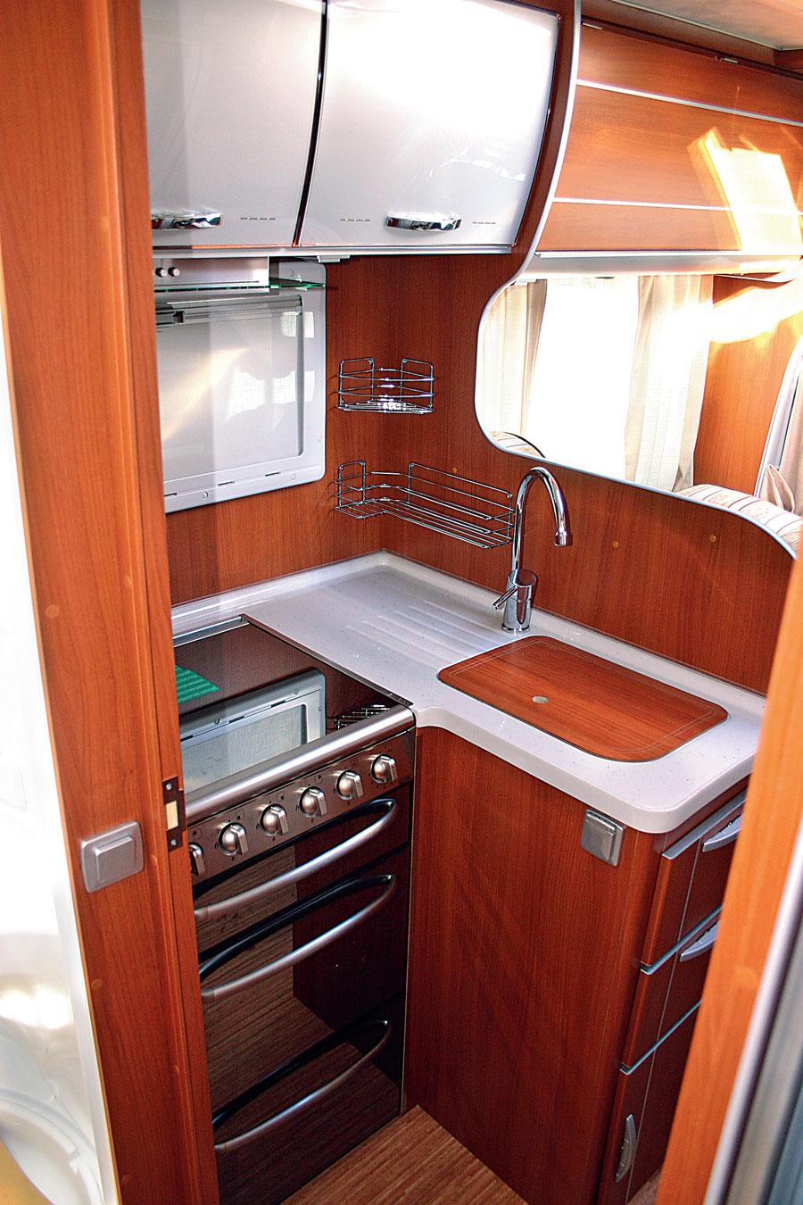 Kjøkkenbenken i vinkel måler 92 x 53/95 x h 93cm. Benkeplaten er laget i tykk glassfiber, men det ser ut som de kunstige steinplatene som benyttes i dyrere biler. Det er oppvaskkum og stekeovn med grill og fire kokebluss. Lufting er intet problem, i tillegg til avtrekksvifte er det luftevindu og takluke med vifte over benken. Til venstre står stekeovnen, til høyre er det to mindre skuffer og et skap under. Inne i vinkelen er plassen ikke benyttet, 40 x 50cm i benkens høyde kunne lett vært brukt på en praktisk måte. Overskapene er greie nok, med fine dører med LED pyntebelysning. På motsatt side står kjøleskapet av typen Dometic RM 7655L med 143 liter netto volum, derav 26ltr. frys. Bra kjøkken tross litt sløsing med plass.
