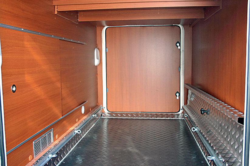 Garasjen under sengene bak måler 220 x 111 x h 110cm, bra mål for to sykler pluss mer. Det er luke (90 x 104cm) på hver side, og lampe på innsiden begge steder. Inne i garasjen er det adgang til varmeren. Klesskapet måler 48 x 48 x h 100cm og, er som tidligere nevnt, plassert mellom sengene bak. Litt dårlig med overskap i soveværelse, hyller er ikke så praktisk under kjøring. Men dette kompenseres av rommene under sengene. Vi har tidligere sett på sløsing med oppbevaringsplass på badet og i kjøkkenbenken.