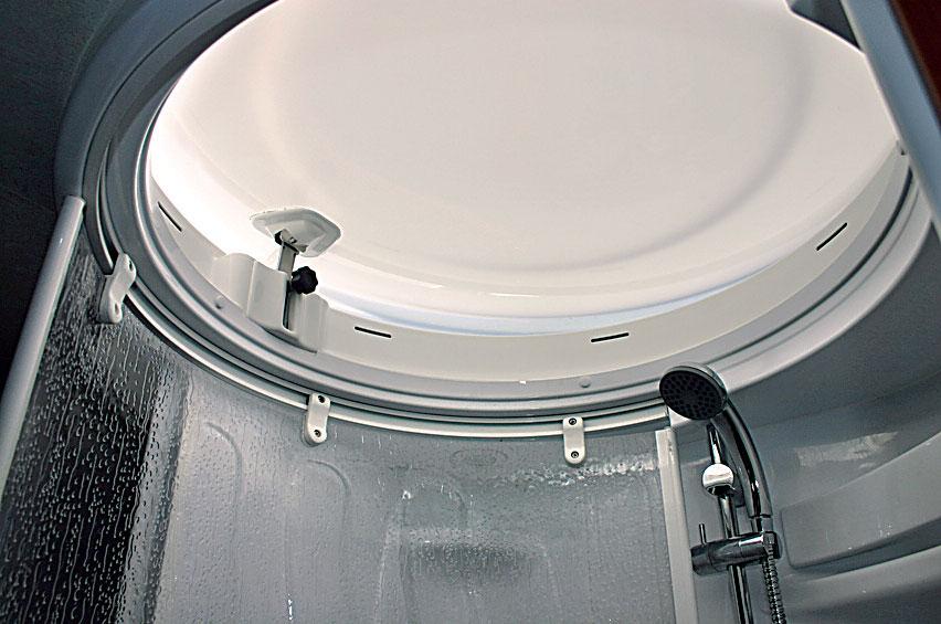 Toalettrommet og dusjen står på hver sin side i bilen ved fotenden av sengene. Dusjen er bra utført og godt fuget, og måler 70 x 75cm da den er nesten sirkelrund. En rund takluke dekker hele taket i dusjen og den kan vippes opp i bakkant. Det er en spot og et lite sete. Toalettrommet måler 93 x 82cm og når skyvedøren lukkes har du akkurat den plassen du trenger ved bruk av do og vask. Under vasken er det et greit benkeskap, men det lille veggskapet mangler hylle og er noe knuslete. Over toalettet er det en smal hylleseksjon, denne kunne godt vært utstyrt med dør og sørget for bedre oppbevaringsplass. En spot og en LED lysrekke gir tilstrekkelig lys og en takluke gir lufting. Rommet har «potensiale » for mer oppbevaringsplass, ellers var vi fornøyd med utførelse.