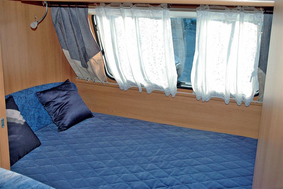 Dobbeltsenga er plassert helt fremst i vogna. God sovekomfort var prioritert da vogna ble skapt. Liggeflaten på senga er på 195 gange 138 centimeter. Madrassen er prøveligget og er mer enn godkjent. Under senga er det flust med lagerplass. Deler av denne plassen kan nåes via ei utvendig lasteluke. På endeveggen over vinduet er det ei overskapsrekke i hele vognas bredde. Høyden er 37 centimeter, mens dybden er om lag 40 i snitt. Noe mer nede og noe mindre øverst. Skaprekka har tre dører. På sideveggene er det to små hyller og i hjørnene i hodeenden er det to lesespotter. Soverommet kan deles av fra resten av vogna med et forheng. Sittegruppa kan gjøres om til ei seng for to små barn.