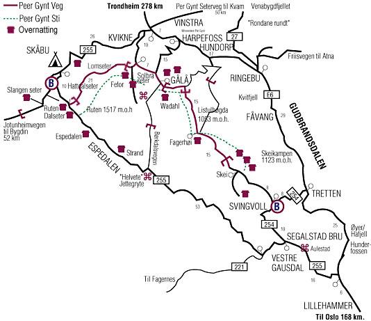 Veien er på drøye 6 mil og går gjennom det som blir betegnet som ”Peer Gynts Rike”. Det hele er en bomvei der bomstasjonene er plassert ved Fefor, Dalseter, Gålå og Skeikampen. Store deler av veistrekningen går i åpen høyfjellsnatur med vid utsikt. På turen passerer man også flere setre som fortsatt er i drift.Turistbedriftene i området har lagt til rette for flere former for aktivitet i et lett tilgjengelig turterreng, der du fra toppene kan se til Hemsedalsfjella, Jotunheimen, Dovrefjell og Rondane.Av steder som passeres på turen kan tas med Skeikampen med mange former for fritidsaktiviteter, Fagerhøi med gode fiskemuligheter, Listulhøgda som med sine 1053 moh er turens høyeste punkt. Gålå er det er et setermuseum og det er her som det i august hvert år, på friluftsscenen ved Gålavannet, blir oppført Henrik Ibsens Peer Gynt til musikk av Edvard Grieg. Espedalen blir ofte betegnet som den vennlige villmarken, og her kan man oppleve en spesiell flora samt minner fra gruvedrift tilbake på 1600-tallet.Veien er stengt i vinterhalvåret, men åpnes vanligvis rundt 1. juni.