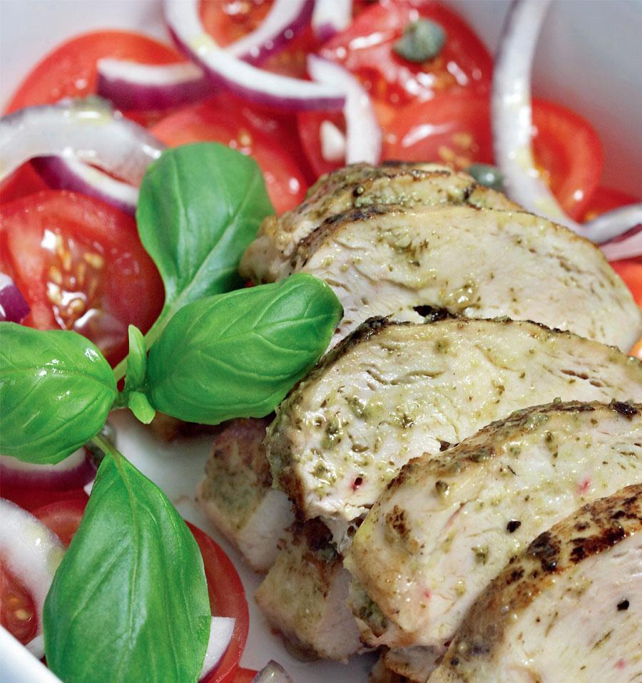 6 stk kyllingbryst½ glass basilikumpesto1 dl olivenolje6 stk store tomater1 stk liten rødløk2 ss kapersNoen dråper olivenoljeSalt og pepperBasilikumblader- Bland sammen pesto og olivenolje. Ha blandingen over kyllingen og pensle kjøttet så alle sidene får smaken av pestoen.- Enten kan du steke kyllingbrystene på middels varme i ca. 15 minutter i stekepanne, eller bare brune de. Da trenger de ca. 15 minutter på 180 grader i ovnen etterpå.- Lag salat: Kutt tomat og løk i tynne skiver og legg lagvis i en form. Tilsett kapers, olje, salt og pepper og noen blader basilikum.