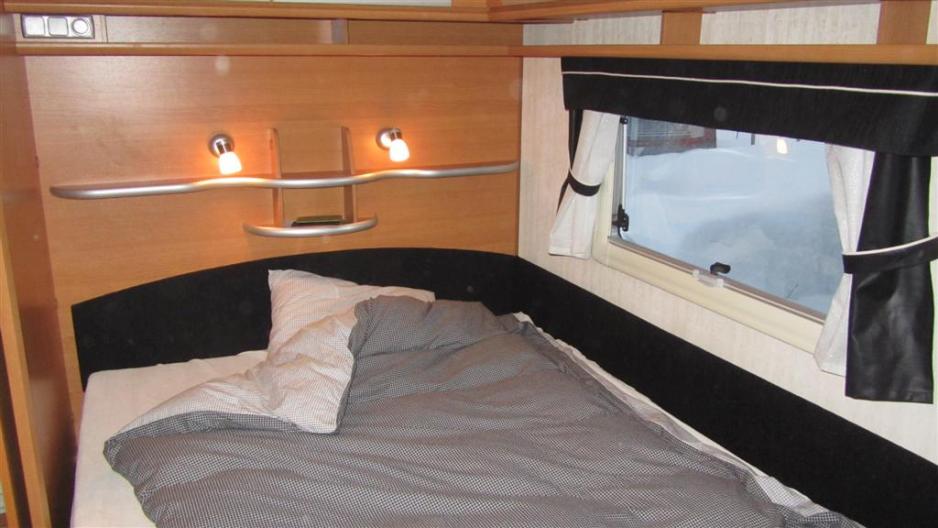 Soveværelset er romslig og man har god plass til alle tingene sine. Dobbeltsengen har en fantastisk madrass, der man sover godt. Det betyr alt i ferien. Under sengen er det et stort oppbevaringsrom til bl.a. campingmøbler. Toalettet er også stort og man har god plass. Plassen er en av kvalitetene i denne vognen.I det store garderobeskapet er det ekstra varmt og utlufting, noe som gjør det til et ideelt sted å henge yttertøy og sette skoene, som man har brukt ute i snøen. Under sittegruppen er det skiboks.