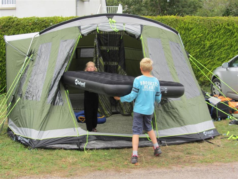 Når hele bilen er tømt begynner vi å sette opp teltet. Det går greit, når vi hjelper hverandre og barna er flinke hjelpere. Teltstengene har fargekoder, så man lett kan se hvor de skal sitte, så i løpet av få minutter, er vi klar til å plugge og bære tingene på plass.