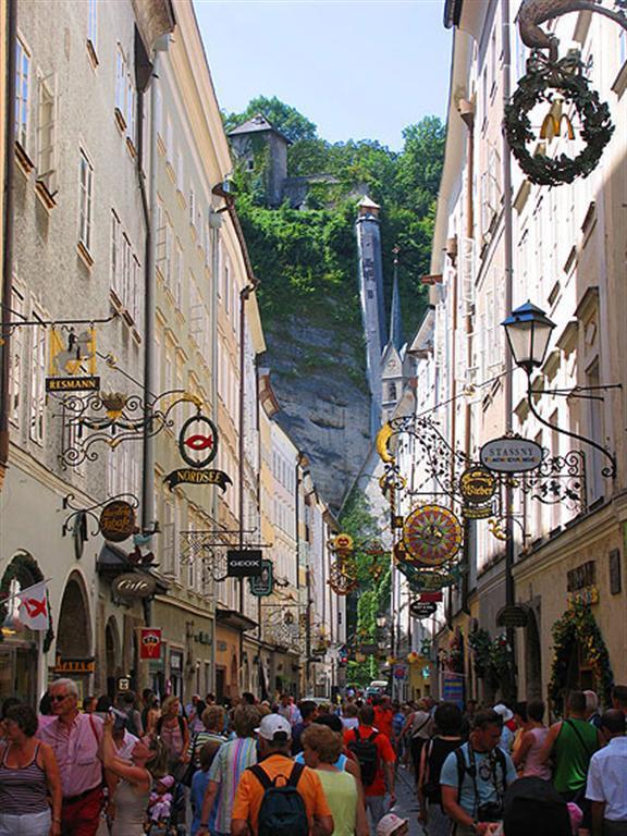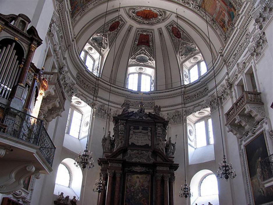 Ved å følge Getreidegasse mot øst kommer man forbi Mozarts fødested. Over det meste av den indre byen kan man oppleve gatemusikanter og man er ikke på noe tidspunkt i tvil om, at Salzburg er Mozarts by. Dette, selv om både Wien og Praha gjerne vil være med på å hylle komponisten. Musikkens stemning oppleves ingen steder så intens som nettopp her. Spaserer man videre gjennom Kranzlmarkt og Judengasse kan man ikke unngå å komme forbi domkirken til Mozartplass. Her har byen satt opp en stor fontene rundt en statue av den verdensberømte komponisten. Domkirken er naturligvis verdt et besøk og har du lyst på enestående musikalske opplevelser, så finner det sted fantastiske konserter under domkirkens kuppel, hvor orgelet er delt opp i 4 enheter og plassert på hver sin søyle. Så de kunne det der med quadrofoni allerede i 1625!