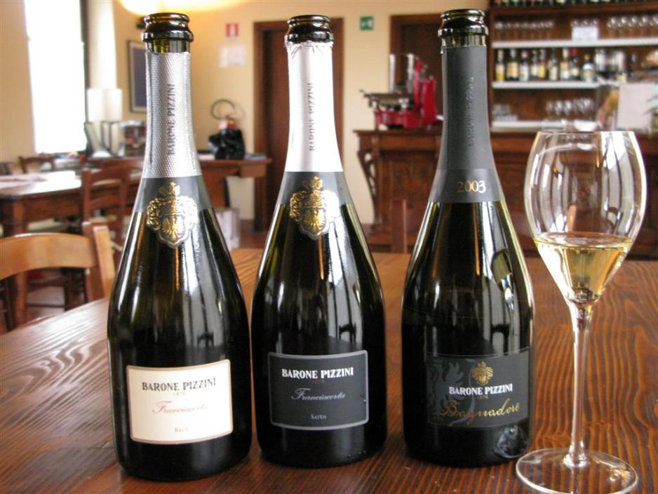 I landsbyen Temoline besøker vi en av de eldste vingårdene i Franciacorta, Baron Pizzini, grunnlagt i 1870, som helt siden da har spilt en sentral rolle i utviklingen av hele vinkulturen i området - deriblant innføringen av økologisk vinproduksjon. Denne premierte vingården benytter ”organisk vinkultur”, noe som betyr at det ikke benyttes kjemikalier eller syntetiske pesticider på vinmarkene, som bare får tilført organisk materiale som gjødning. Vingården dyrker i dette området vin på 50 hektar, men Barone Pezzini er også representert i andre områder av Italia – Maremma, Castelli di Jesi og Salento og eier i alt 160 hektar vinmarker. Det er derfor en ganske betydelig vingård vi besøker. I en helt moderne bygning - uten den minste form for romantikk - ser vi et supermoderne produksjonsanlegg og hører om hvorledes de håndplukkede druene blir behandlet til den ferdige, herlige musserende vinen. Dette ses også ved et besøk i vinkjelleren 10 meter under jorden, der tusenvis av flasker står med bunnen i været og bare venter på å bli drikkemodne. De fineste vinene står i 4 år til ettergjæring og bunnfelling! Den populære musserende vinen Franciacorta er framstilt som en ekte champagne - i motsætning til den like så berømte og litt billigere spumante - men det er naturligvis bare musserende vin fra det franske vindistriktet Champagne, som har lov til å benytte navnet ”Champagne”.