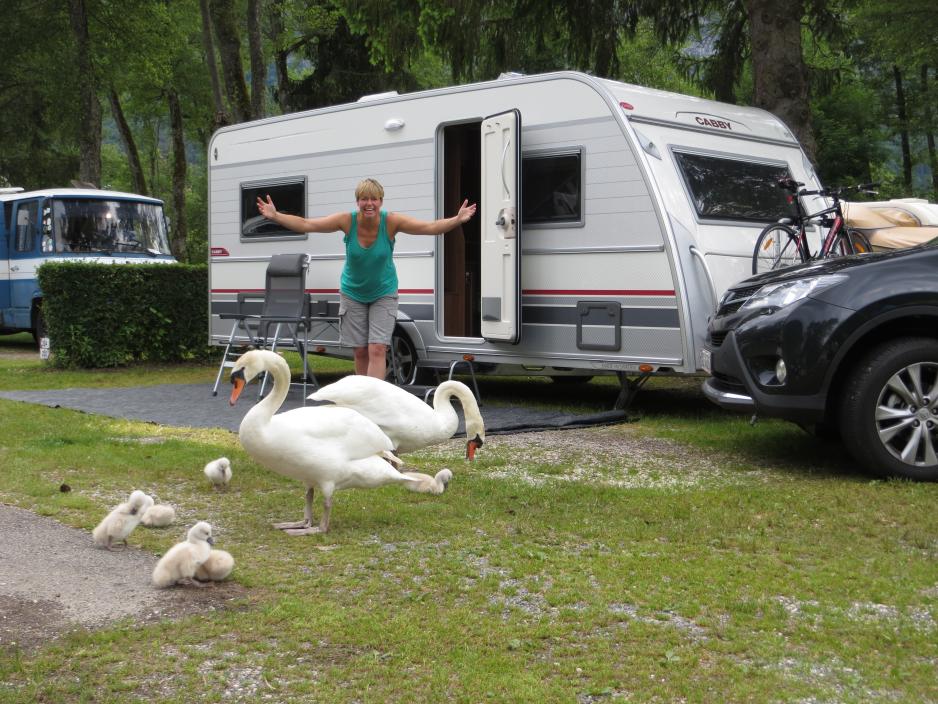 Tilbake på campingplassen er stemningen også på topp. Utsikten er fabelaktig og det er bare noe helt spesielt ved å bo så tett på naturen. Mens jeg går og setter opp campingmøblene og solseilet, får jeg besøk av et svanepar med seks små svaneunger - herlig. Det er nettopp opplevelser som dette, som gjør campingferie til den beste ferieformen, som finnes.
