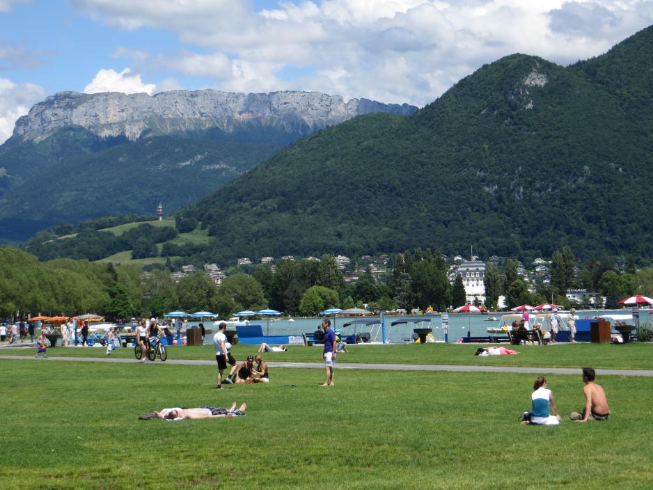 På mange måter kan man si at Annecy er delt i to. Det er bydelen nede ved sjøen, der man koser seg på gresset. Ute på vannet nytes båtlivet. Flere steder kan man saktens leie en liten båt og begi seg ut på vannet.