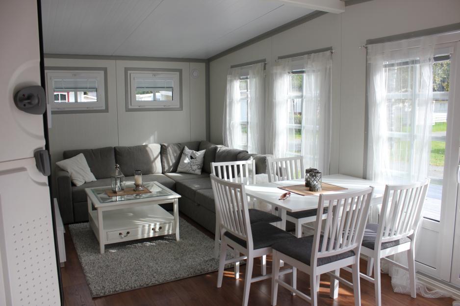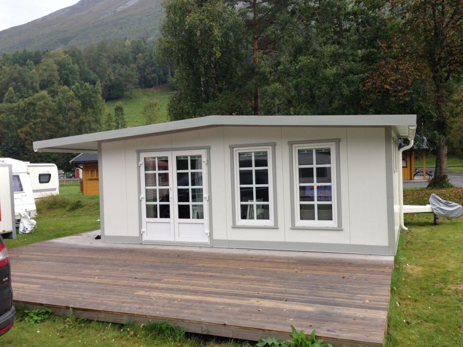 Førresfjorden i Rogaland.Tak: 70mm sandwichplater.Vegger: Sandwich galvanisert og pulverlakkerte stålplater.Vinduer: Vinduer med doble isolerglass. Rammene og karmer i lakkert aluminium. Alle standard vinduer kan åpnes.Dører: Låsbare. Skyvedører, enkelt dør, hel-glasset dør.Festematerialer: Huset blir prøvemontert på fabrikk. Popnagler benyttes.Brennbare materialer: Rockwool eller skum oppfyller minstekravet på EI15.Farger: Off-white med hvite beslagProdusentland: Kina.Skjøt mot vogn: Dobbel skinnepresenning i tak.Annet: Tre typer isolasjon: Isopor, Rockwool, flammehemmende polyretan skum (brannhemmende, god isoleringsevne). Kan levere fjerdevegg. Caravansleider kan drives med hånddrill.Priseksempel (5x3,5m): 87 500 kr med polyuretan, uten sprosser, uten montering, med mva.Priseksempel 2: (7x3.5m): 87 500 kr med polyuretan, uten sprosser, uten montering, med mva.