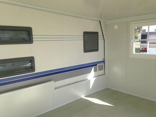 Sandnes i Rogaland.Tak: 60/98mm sandwichplater, profilertVegger: 60mm tykke sandwichvegger i brannhemmende skum.Vinduer: To typer, campingvognvindu eller isolerglass med PVC-ramme.Dører: Enkle, doble eller skyvedører. Låsbare.Festematerialer: Beslag og skruer, enkel montering og demontering.Brannsikkerhet: B-S2, d0. Oppfyller EI15.Farger: Antikkhvit med grått beslag. Kan lakkeres i mange ulike farger.Produsentland: Norge.Tilkobling vogn: Takduk som festes i vogna, langs sidene monteres det en pølse.Annet: Fire modeller: Storstuen, Willa, Standard og Di Lux. Tilleggsutstyr: Bod, inngangsparti, takutstikk, dekorstriper. De fleste modeller leveres med 60mm plater, noen leveres med 30mm. Levegg med samme brannhemmende spesifikasjoner eller opp til EI 30. Har 20-års jubileum i 2013.Priseksempel 1 (5x3,5m): 94 700 kr Storstuen uten montering med moms87 500 kr. Willa uten montering med moms74 200 kr. Di Lux Caravan uten montering med moms. 86 300 kr Di Lux PVC uten montering med moms.Priseksempel 2 (7x3,5m): 118 400 kr Storstuen (kun denne modellen leveres standard over 6m) uten montering med moms.