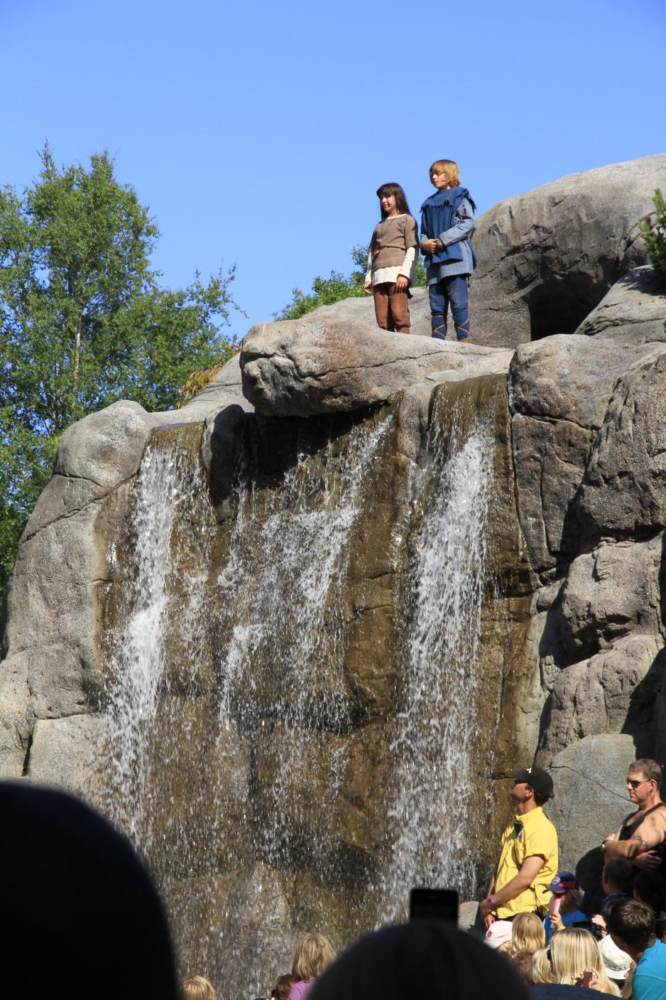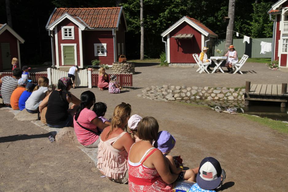 Etter et stort show på en stor scene med mange mennesker, er det behagelig å kunne ta en tur til en av de mindre plassene. Det er bygget opp et lite autentisk miljø til de fleste av Astrid Lindgrens figurer, og her er det mange skuespillere som gjør små oppsetninger til faste tidspunkter. Er du riktig heldig kan du i tillegg, som oss, treffe på for eksempel Madiken og Elisabeth med deres husholderske. I forkant av denne forestillingen var et par håndfuller publikum og skuespillerne samlet under et tre og lekte en ekte gammeldags mimelek. Fascinerende å se hvordan barn setter pris på voksne som vil leke. Litt senere på dagen traff vi på en tyv og to politikonstabler som ble fulgt av en liten tilhengerskare med barn. Og det var ikke rart, for det virket som om skuespillerne egentlig hadde pause, men likevel spilte sine rollefigurer og inkluderte publikum mens de spiste is og slappet av i varmen. En artig og autentisk opplevelse både for liten og stor. Det er nettopp slike litt tilfeldige men nære møter med mennesker som har et ekte engasjement som gjør denne parken helt unik.