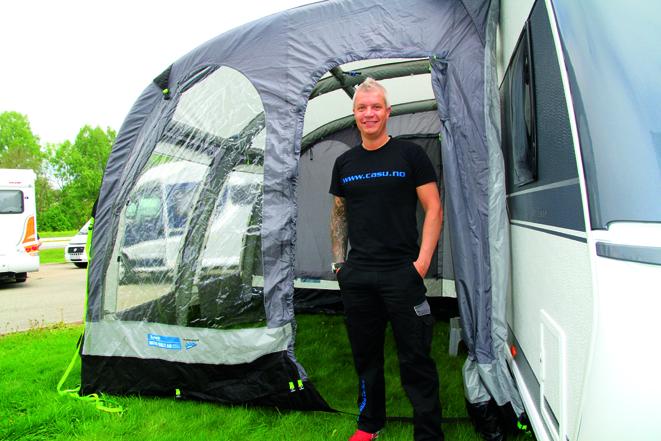 Glenn Dahle fra Caravan Supply AS demonstrerer hvordan du enkelt kan sette opp et Kampa Rally Air 260 oppblåsbart fortelt. Foto: Tore Afdal