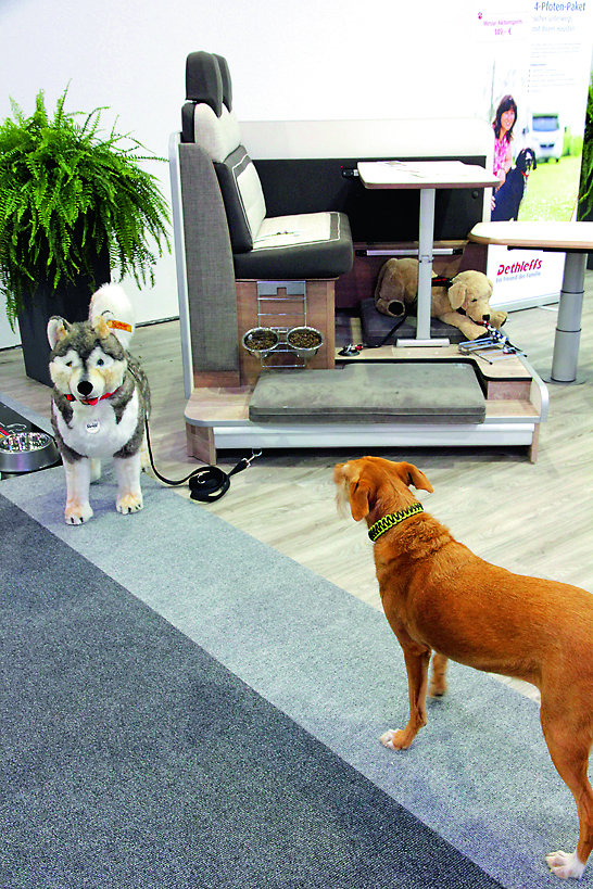 I fjor var det 360 graders kamera, i år var det en hundeutstyrpakke. I praksis snakker vi om en praktisk holder for vann- og matskål som kan henges på skuffer eller sittegruppen. I tillegg leveres en skummadrass med avtagbart trekk for din firbente reisekamerat, samt et sikringspunkt hvor du kan feste dyrets sele under kjøring. I tillegg får du en utvendig krok for enkelt å binde din hund når du er fremme. Utstyrspakken tilbys på nye bobiler, og kan være aktuell både for katter og hunder, ifølge produsenten. Pris vil sannsynligvis havne på rundt 2-3000 kroner.