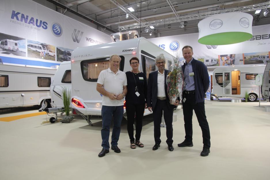 Finn Langtved som er Knaus norske representant, Kari Olstad fra Norges Varemesse, Mauro Degasperi fra Knaus Tabbert-gruppen og Konrad Sel fra Caravamessen var alle strålende fornøyd med Knaus nye stand.