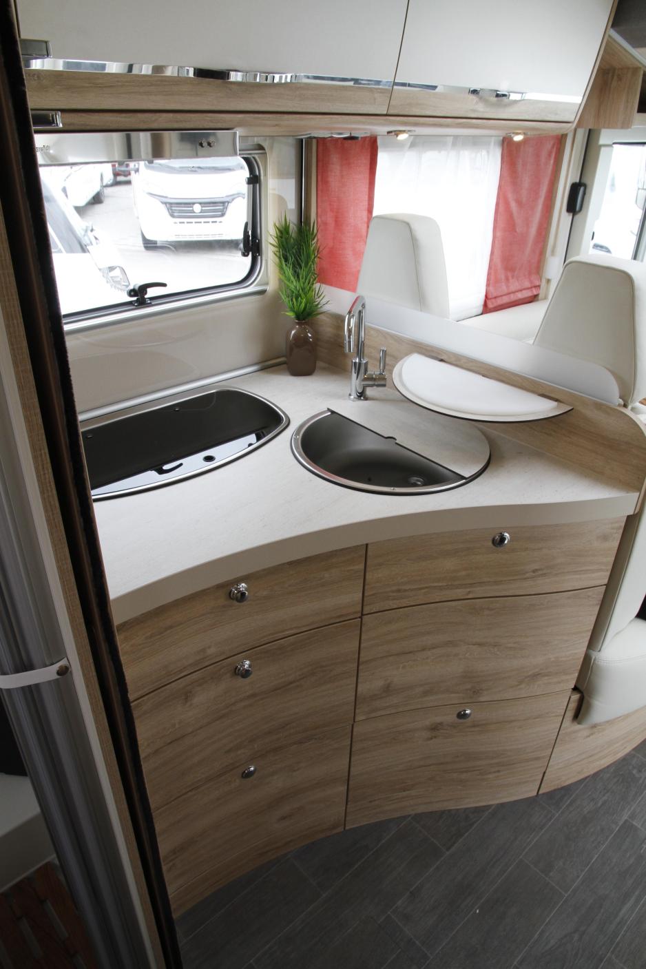 Sprendlingen, Tyskland: Det er en spesielt lys og trivelig modell jeg sitter i. Den 7,1 meter lange bobilen har som alle Eura Mobils bobiler dobbelt gulv. Sammenlignet med fjorårsmodellen IL720QB er det skjedd flere endringer: Lyset ved sittegruppen er plassert direkte på overskapet, slik at du ikke lenger skaller i det. Det er vesentlig bedre plass i kjøkkenbenken, da gasskassen ikke lenger er plassert her. Dobbeltsengen har elektrisk drevet hydraulisk heve- og senkefunksjon. Så du kan prioritere å ha med sykler i garasjen (opp til 125 cm), eller en lavere seng (20 cm).